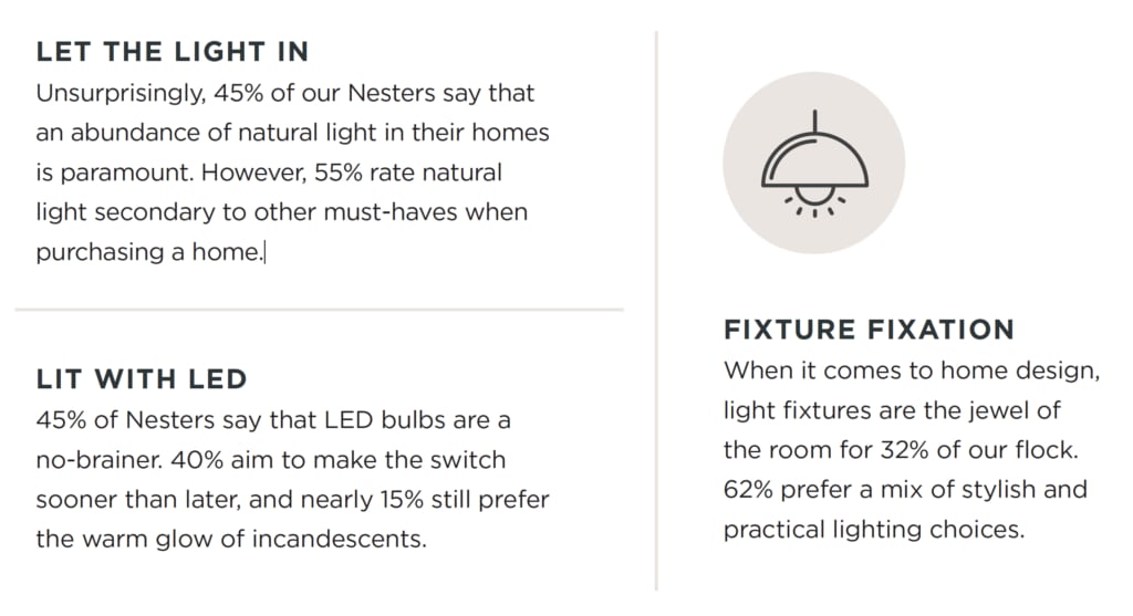 Let the Light In Unsurprisingly, 45% of our Nesters say that an abundance of natural light in their homes is paramount. However, 55% rate natural light secondary to other must-haves when purchasing a home.
