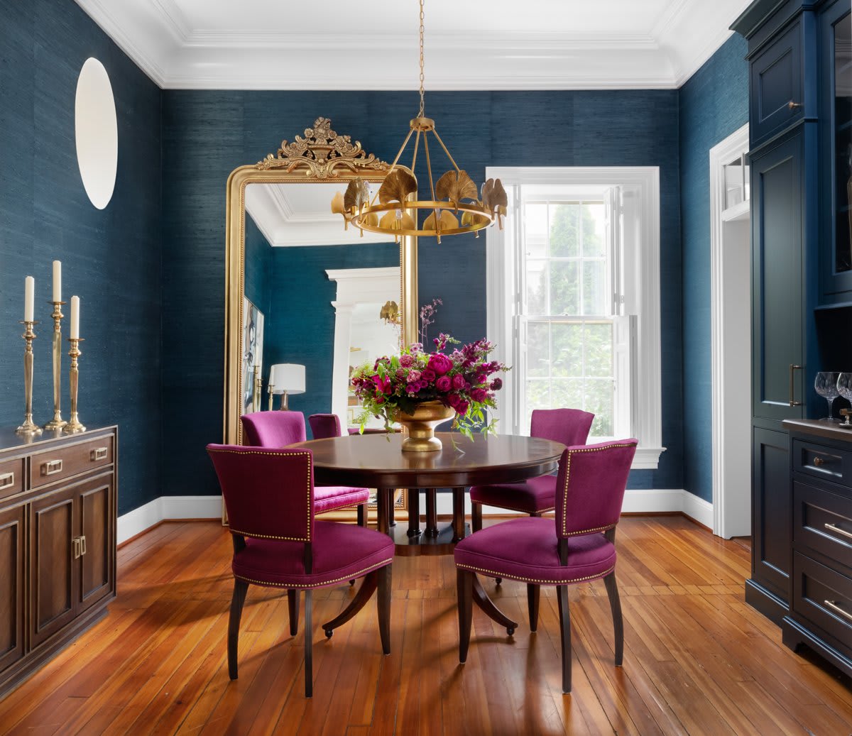 Bigger is always better when it comes to mirrors, she says. Mearns employed an extra tall leaning mirror to maximize the drama in this 11-foot-tall dining room wrapped in a beautiful flora wallpaper. “The reflection of a mirror can also double the light from a candle, or the impact of a stunning chandelier,” Mearns adds.