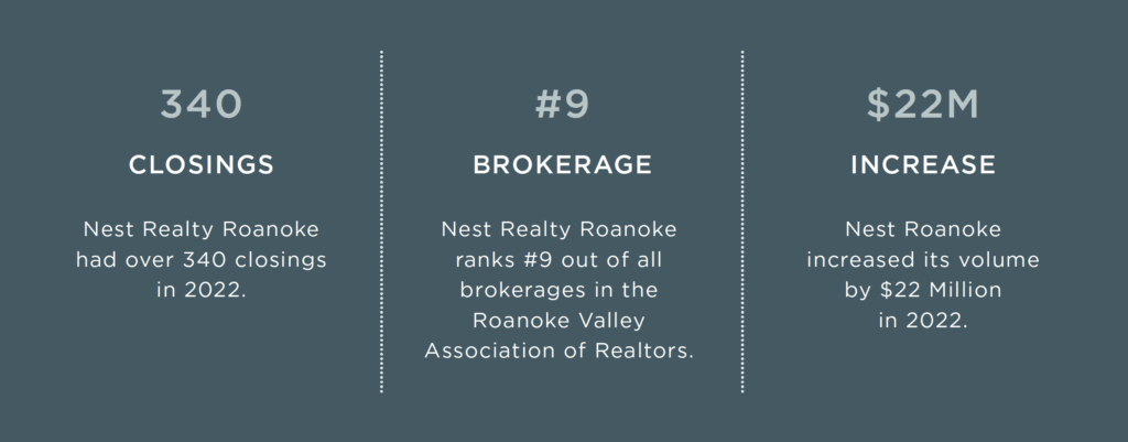 2022 was an incredible year in many ways. With all of the twists and turns that the year brought, the numbers actually showed a decline across the market in overall volume from 2021. While many local firms finished the year with a strong decrease in sales volume, Nest Realty Roanoke increased its volume by $22 million, annually. We successfully helped over 400 families buy, sell, or invest in real estate. We can’t thank you enough for trusting us with your real estate needs. Let’s continue to build and grow together in 2023!